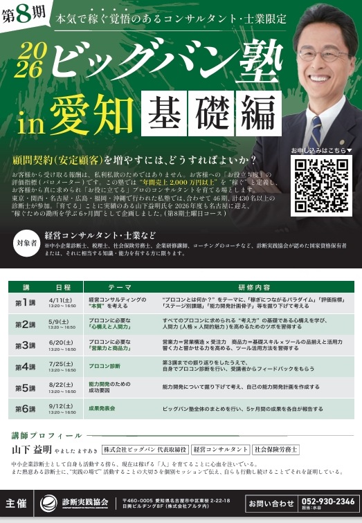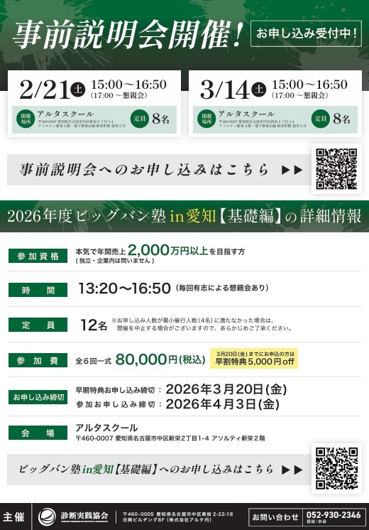 そんな方へ、弊社代表・加藤が代表理事を務める診断実践協会にてビッグバン塾 in愛知[基礎編](第8期)の事前説明会(無料)を開催します。