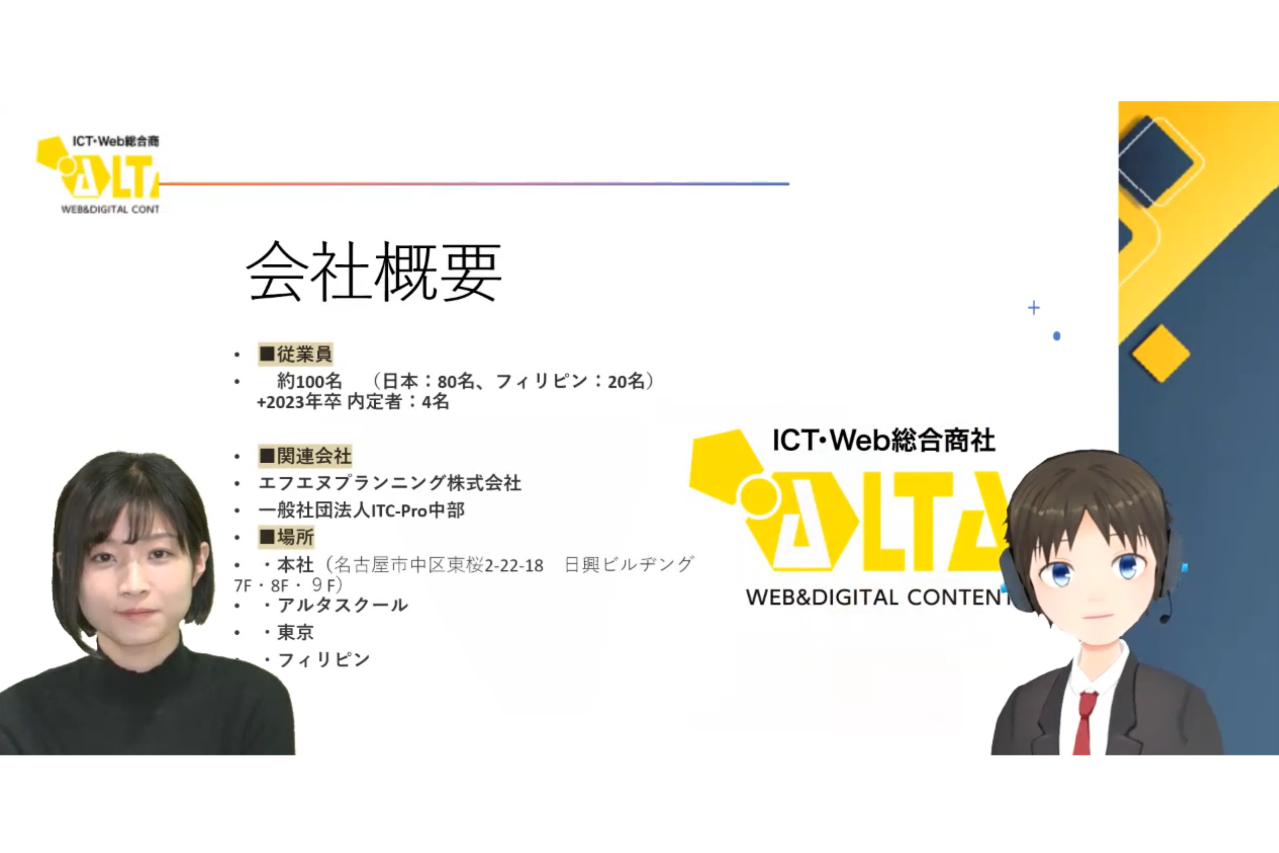 12/21(水)インターンシップ参加者向け Web会社説明会を開催しました 2022/12/22 Zoomを使用してWeb会社説明会を開催いたしました。 引き続き、3Dキャラクターと社員での対話形式を取り入れて実施。 また、先輩社員への質問コーナーでは 総務部の社員2名でお答えいたしました。 多数のご質問をいただきましたが、学生の皆様の疑問が少しでも解消されていましたら幸いです。 ご参加いただいた皆さま、ありがとうございました。 アルタでは年間を通してインターンシップの受け入れを行っております。 ご興味のある方は、こちらからお気軽にお問い合わせください。