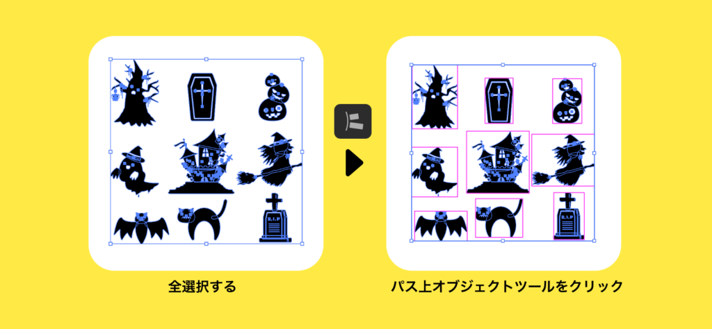 この時、各オブジェクトをグループ化させておきましょう。グループ化されてない状態でパス上オブジェクトツールを行うと、バラバラのパーツが均等整列されてしまいます。
