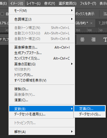 変数機能は「イメージ」→「変数」→「定義」から設定する事ができます。