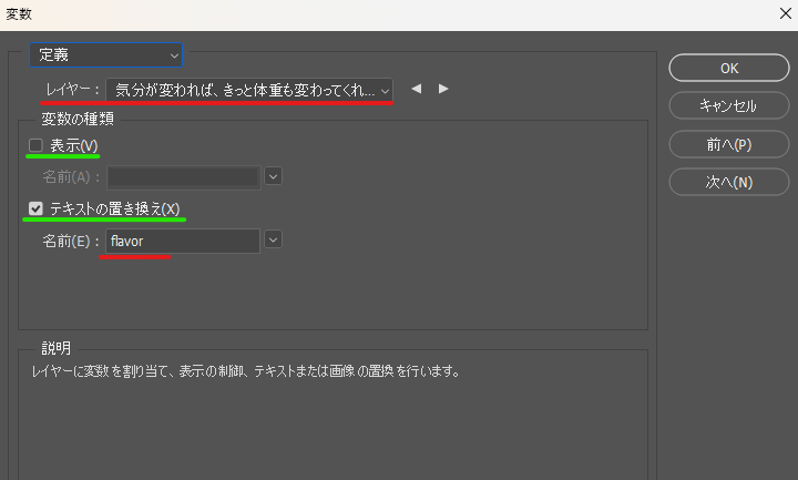 どちらの変数を選ぶにしても、名前をつける必要があります。今回では「flaver」という名前がついています。これを変更したいレイヤーに適応していきます。
