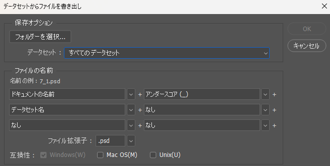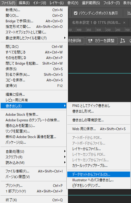 PhotoshopとExcel(csv)のデータが完成したら、いよいよ書き出しです。