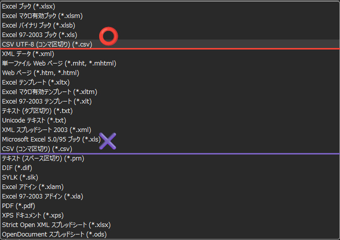 csvの書き出しは2種類ありますが、UTF-8のcsv書き出しを選んで下さい。