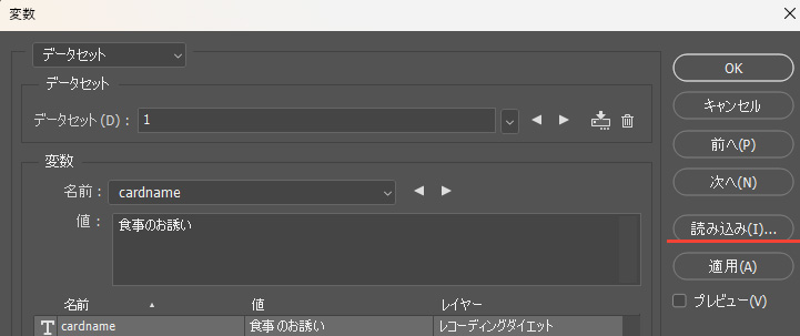 Photoshopで設定した変数の種類は、必ず全てExcelの項目として書かなければいけません。