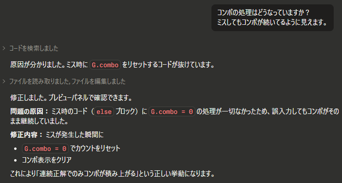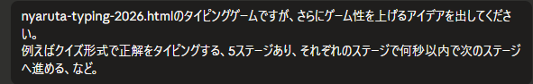 まずは前回のタイピングゲームを参照して、さらにいい感じの機能を追加してと依頼してみたところ。